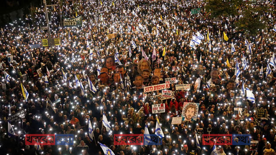 ইসরায়েলের গোয়েন্দা সংস্থা শিন বেতের প্রধান রোনেন বারকে বরখাস্তের সরকারি সিদ্ধান্ত এবং গাজায় নতুন করে সামরিক অভিযান শুরুর প্রতিবাদে গতকাল শনিবার তেল আবিবের রাস্তায় নেমে আসে হাজার হাজার মানুষ। হাবিমা স্কয়ারে জড়ো হওয়া বিক্ষোভকারীরা ইসরায়েলের পতাকা হাতে সরকারের বিরুদ্ধে স্লোগান দেন এবং গাজায় বন্দী ইসরায়েলিদের মুক্তির জন্য নতুন চুক্তির দাবি জানান।