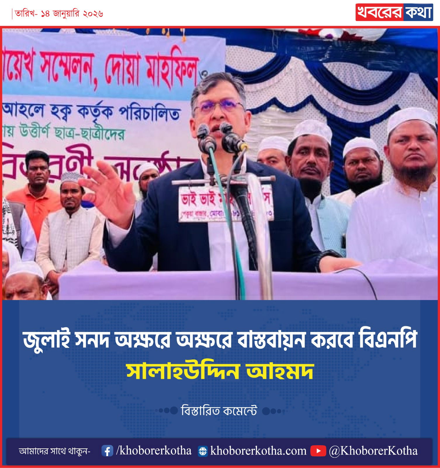 জুলাই সনদ অক্ষরে অক্ষরে বাস্তবায়ন করবে বিএনপি: সালাহউদ্দিন আহমদ