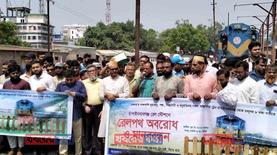 চাঁপাইনবাবগঞ্জ থেকে ঢাকা পর্যন্ত চারটি আন্তঃনগর ট্রেনের রুট বর্ধিত করাসহ ৮ দফা দাবিতে রেলপথ অবরোধ ও মানববন্ধন কর্মসূচি পালন