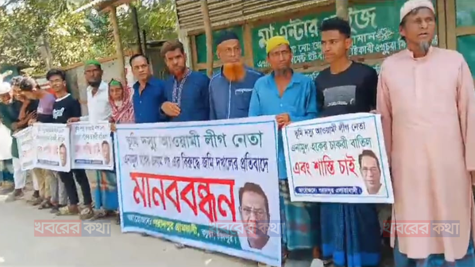 চাঁদপুরের কচুয়ায় ভূমিদস্যু এনামুল হকের বিচারের দাবিতে এলাকাবাসীর মানববন্ধন